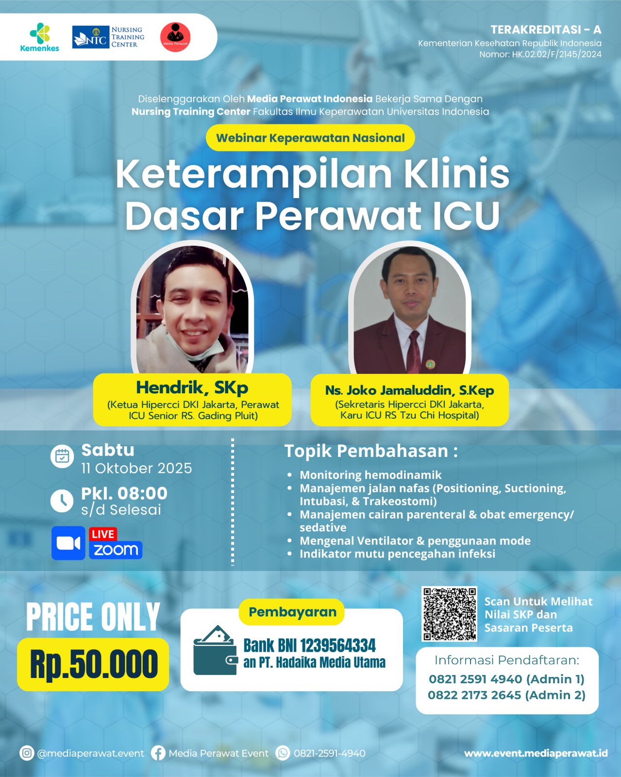 Webinar Keperawatan: Keterampilan Klinis Dasar Perawat ICU Webinar Keperawatan: Keterampilan Klinis Dasar Perawat ICU mediaperawat • 11 Oktober 2025Download Materi