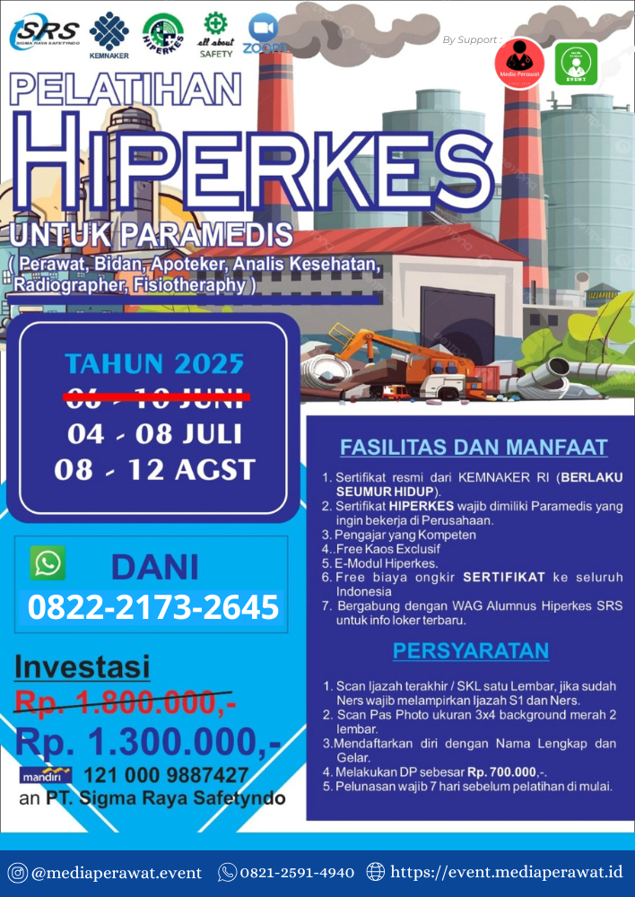 PELATIHAN HIPERKES & KESELAMATAN KERJA BAGI PERAWAT, BIDAN, ANALISIS KESEHATAN, RADIOGRAFER, APOTEKER, FISIOTERAPI Dan PARAMEDIS PERUSAHAAN