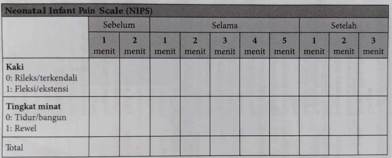 Mediaperawat.id Neonatal Infant Pain Scale (NIPS) merupakan alat ukur untuk mengukur nyeri pada neonatus prematur dan cukup bulan. Alat ini dapat digunakan untuk memonitor neonatus sebelum, selama, dan setelah prosedur yang menimbulkan nyeri seperti venapuncture. Total skor nyeri antara 0-7.