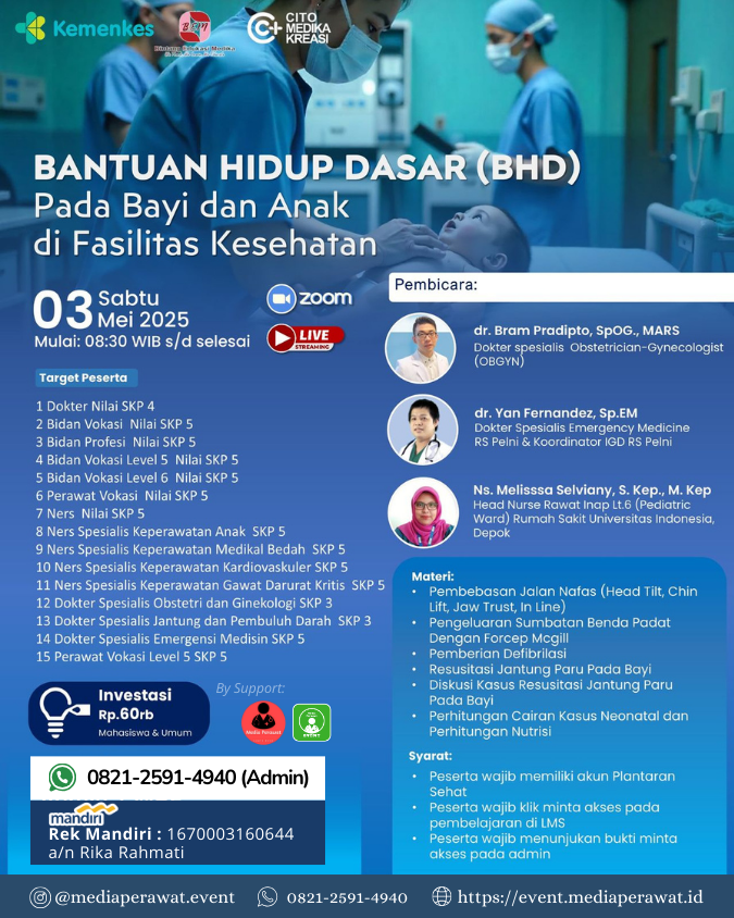 Mediaperawat.id – Ikuti Webinar Nasional Kesehatan dengan tema: “BANTUAN HIDUP DASAR PADA BAYI & ANAK DI FASKES”