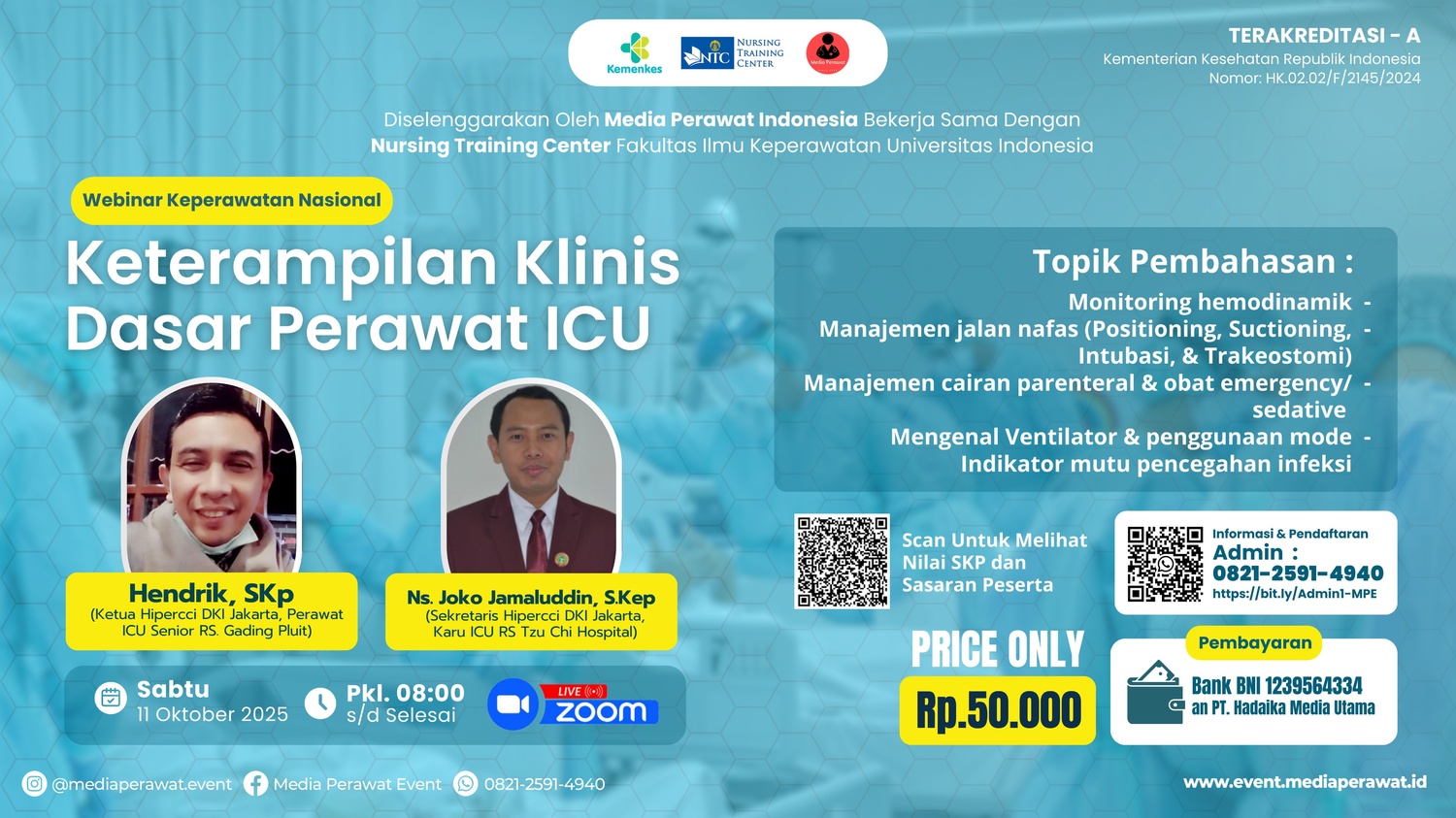 Kuy !! Ikuti Webinar Nasional Keperawatan Critical Care Spesial untuk semua perawat Indonesia, dengan Tema: “KETRAMPILAN KLINIS DASAR PERAWAT ICU” 🏥